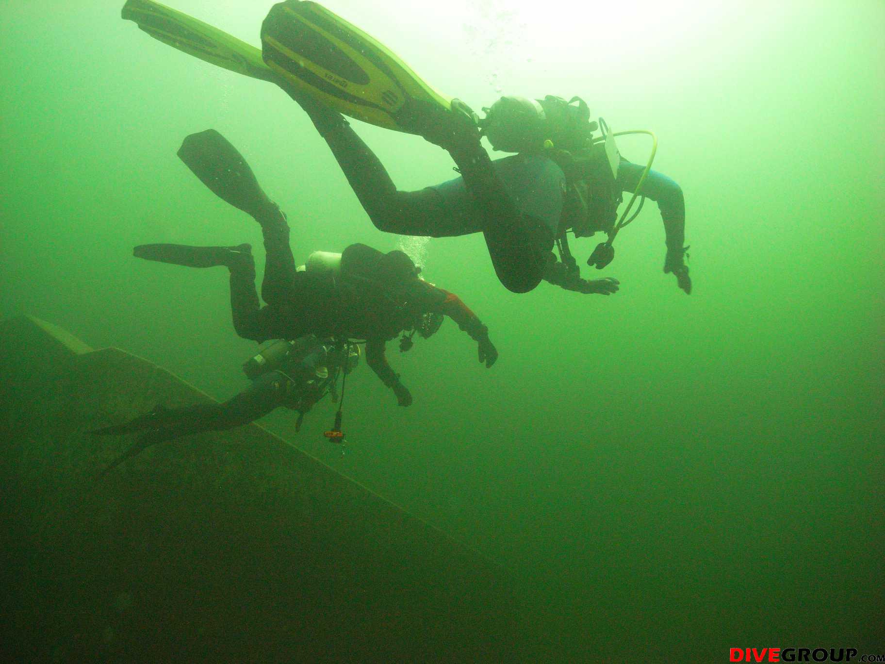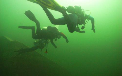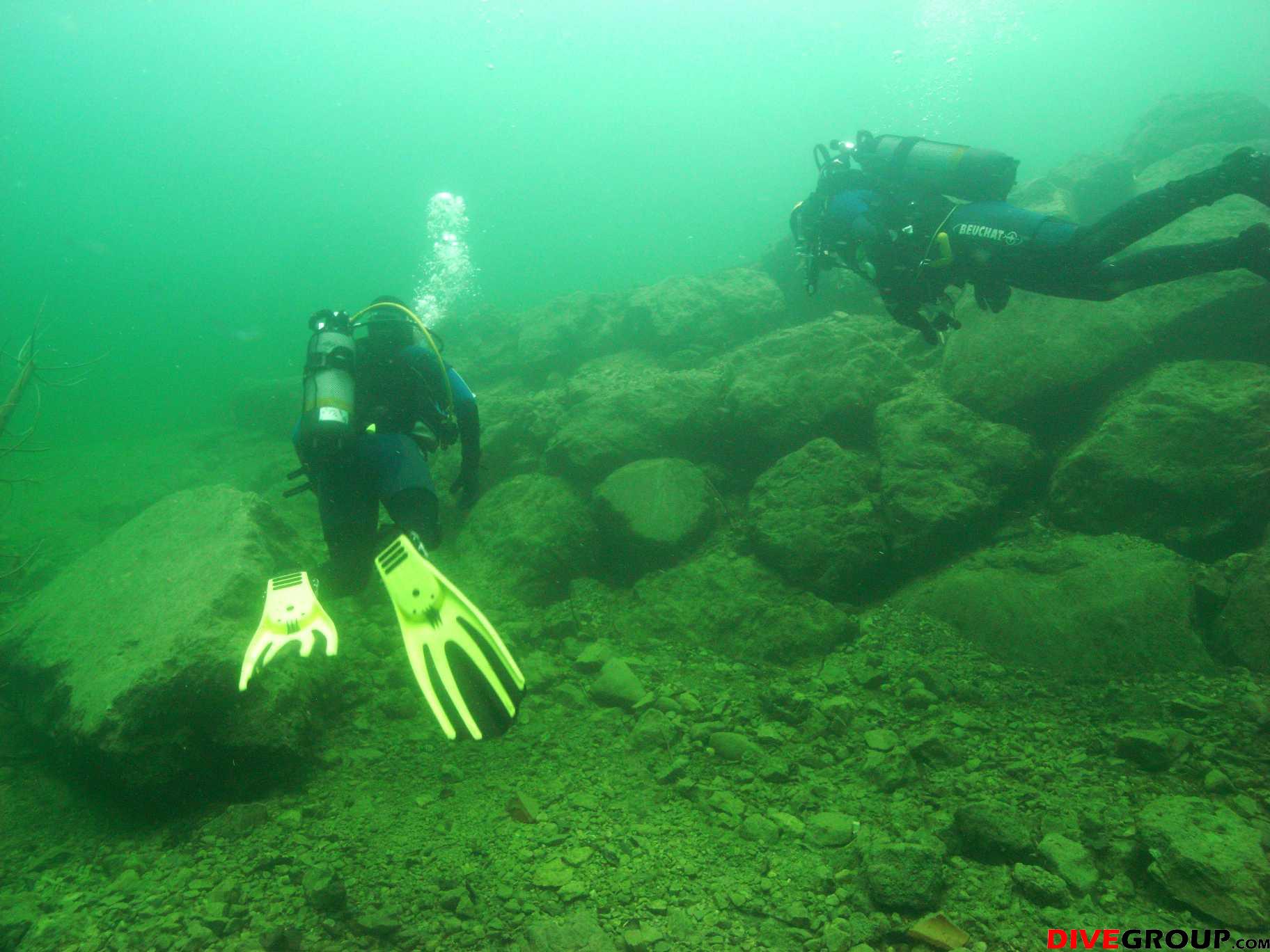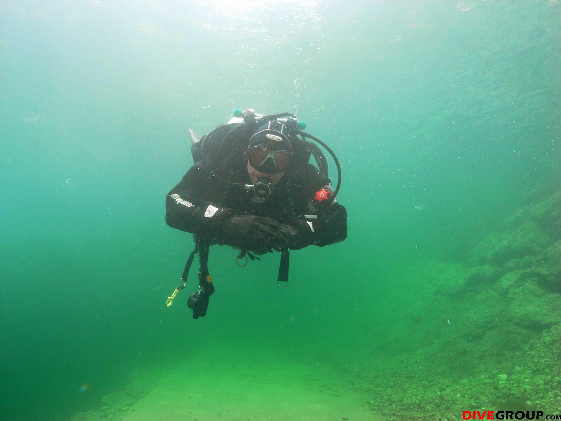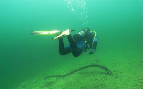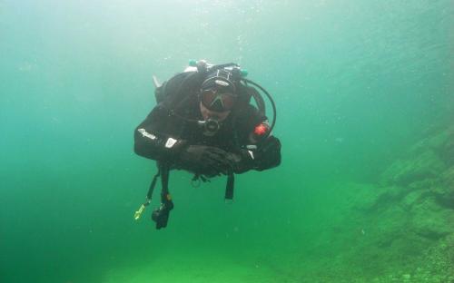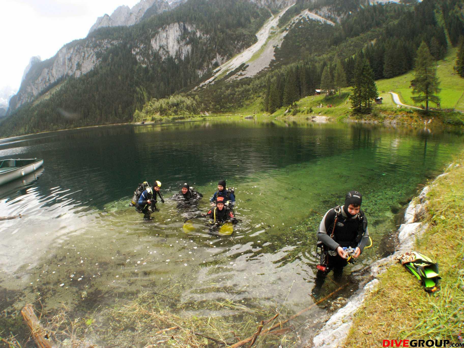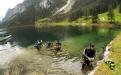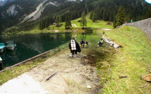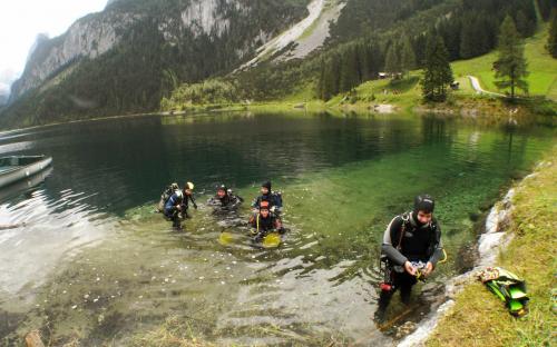 Samstag frühmorgens, machten wir uns auf den Weg zum wahrscheinlich einzigen See der nach den Unwettern der letzten Zeit noch halbwegs Sichtbedingungen haben könnte. Nach unserer Ankunft machten wir sofort einen Lokalaugenschein und von außen sah der Gosausee wirklich sehr gut aus. Voller Vorfreude wurde die Ausrüstung vorbereitet und ein ausführliches Briefing für unsere AOWD Kursteilnehmer gemacht danach stürzten wir uns sofort in die 12° kalten Bergseefluten und tauchten bei ca. 10m Sichtweiten ab. Nach etwa 15m Tiefe kam aber dann die Ernüchterung, schlagartig verringert sich die Sicht auf ca. 2 - 3m. trotzdem konnten wir unseren AOWD Tieftauchgang machen. Großes Lob an Michaela, die ihren Vereiser in der Tiefe ganz ruhig und suverän meisterte.