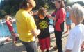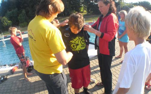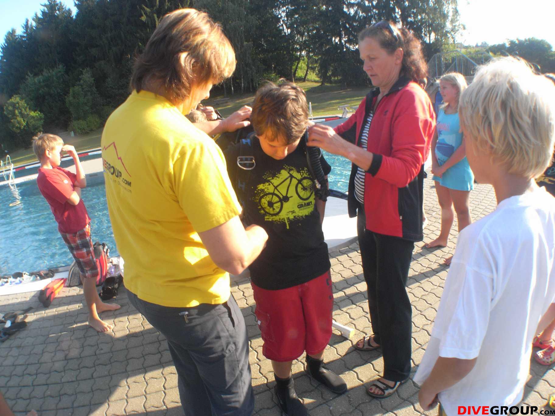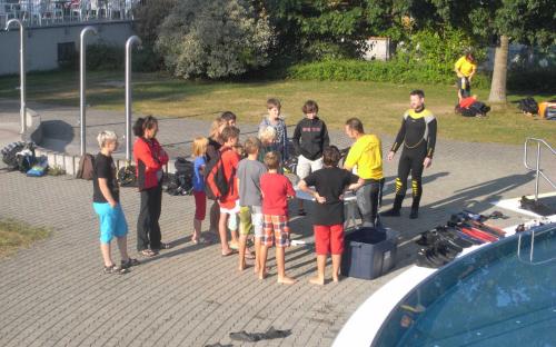 12 Kinder hatten sich angemeldet und nach kurzer Einweisung und Erklärung der Ausrüstung wurden sie von Anna, Angelika und Sandra angezogen, Gitti half ihnen beim Anziehen von Flossen und Maske danach übernahmen Franz und Siegi und zogen einige Runden im Freibad.