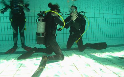 Also starteten wir vergangene Woche mit der Ausbildung im Schwimmbad und da die Temperaturen in unseren heimischen Seen noch ziemlich niedrig sind, entschlossen wir uns, 2 Tage im Indoordivingcenter „Divers“ in Aufkirchen zu verbringen um gleich in etwas tieferem Wasser zu üben. Sie trainierten ehrgeizig um alle geforderten Übungen fürs Freiwasser zu erlernen und zu perfektionieren.